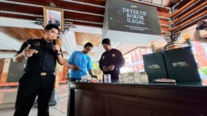 Tampak hadir, narasumber sosialisasi ini, Fungsional Ahli Pertama Bea Cukai Sidoarjo, I Gusti Ngurah Rai Aryawan mengungkapkan data realisasi penindakan terhadap rokok ilegal sejak tahun lalu.