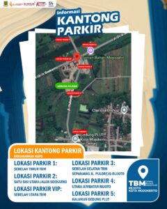 “Kami sudah siapkan informasi kantong parkir, dari berdasarkan google maps, yatu ; lokasi parkir 1 di sebelah timur TBM, sedangkan parkir 2 satu sisi utara jalan Soekarno, lokasi parkir 3 sebelah selatan TBM sepanjang jalan Pulorejo-Blooto. Lokasi