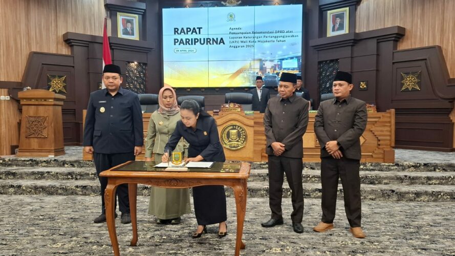 Mojokerto (transversalmedia) – Dewan Perwakilan Rakyat Daerah (DPRD) Kota Mojokerto melaksanakan rapat paripurna dengan penyampaian rekomendasi atas Laporan Keterangan Pertanggungjawaban (LKPJ) Wali Kota Mojokerto Tahun Anggaran 2025, di ruang rapat Gedung DPRD Kota Mojokerto. Rabu (8/4/2026).